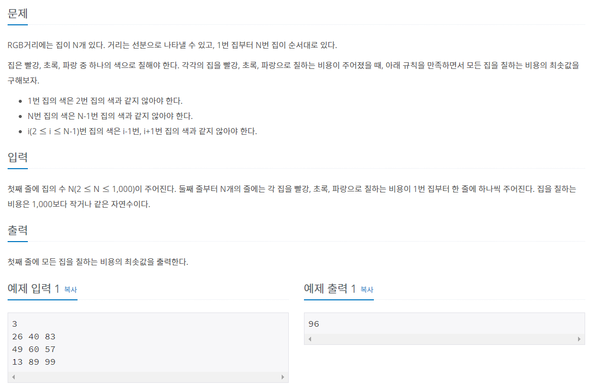 RGB를 같은 색이 반복되지 않게 나열하는 문제다. i번째 집의 색을 각각 빨강(0), 초록(1), 파랑(2)으로 칠하는 비용을 갱신해주면서 반복해주면 된다. i번째 집의 색을 빨강으로 칠한다면, i-1번째 집의 색을 초록, 파랑으로 칠하는 비용 중에서 더 작은 값을 칠해주면 되기 때문에 파이썬의 기본 함수 min을 사용하여 구해준 뒤, i번째 집을 빨강으로 칠하는 비용을 더해줘서 갱신을 해준다. 그 뒤 i+1번째도 같은 원리로 갱신이 되고 결국 N번째에는 각 최소 비용이 들어갈 것이기 때문에 그 3개 중에 최솟값을 찾아주면 된다.