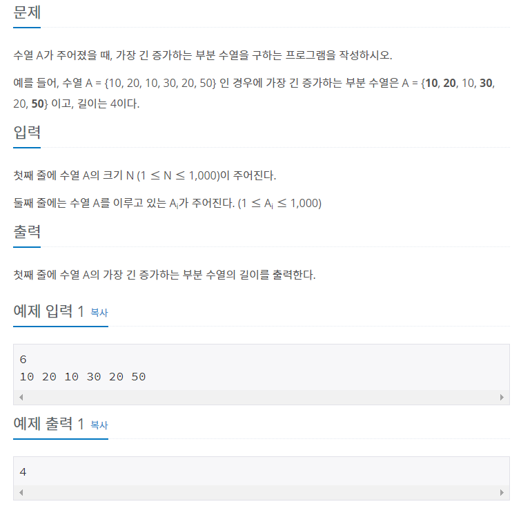 가장 긴 증가하는 수열을 찾는 문제이다. A[0] 부터 A[N-1]까지 돌면서 증가하는 각각의 수열들을 모두 구하고 비교하면 시간 복잡도가 O(n^2)이기 때문에 백준에서는 오답일 것이다. 각 원소마다 비교하는 것은 맞지만 비교할 때 모든 원소를 비교하는 것이 아니라, 이전에 증가했던 수들에 대해서만 비교를 해주면 문제가 풀릴 것이다.