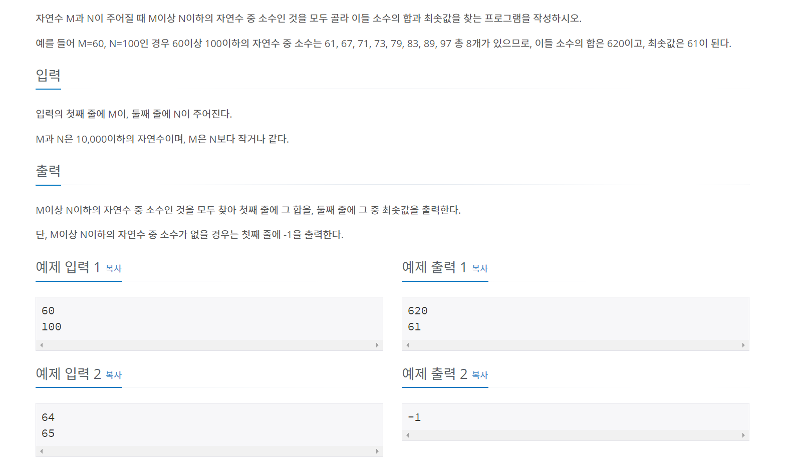 소수를 구하는 법을 안다면 그렇게 어렵지 않은 문제이다. 입력 값도 10,000이하의 자연수이기 때문에 시간초과 걱정은 안해도 된다. M부터 N까지 반복문을 돌리면서 값이 소수인지 판별해주면 되겠다. 소수를 구할 때 2부터 나누어주면서 진행하기 때문에, 2가 소수라는 사실을 잊기 쉬우니 조심하자. 최솟값을 구할 때는 첫번 째 값일 때 즉, sum이 아직 0일 때 구한 값을 최솟값으로 초기값으로 설정해 준 뒤 그 뒤부터 비교를 해주면 된다.